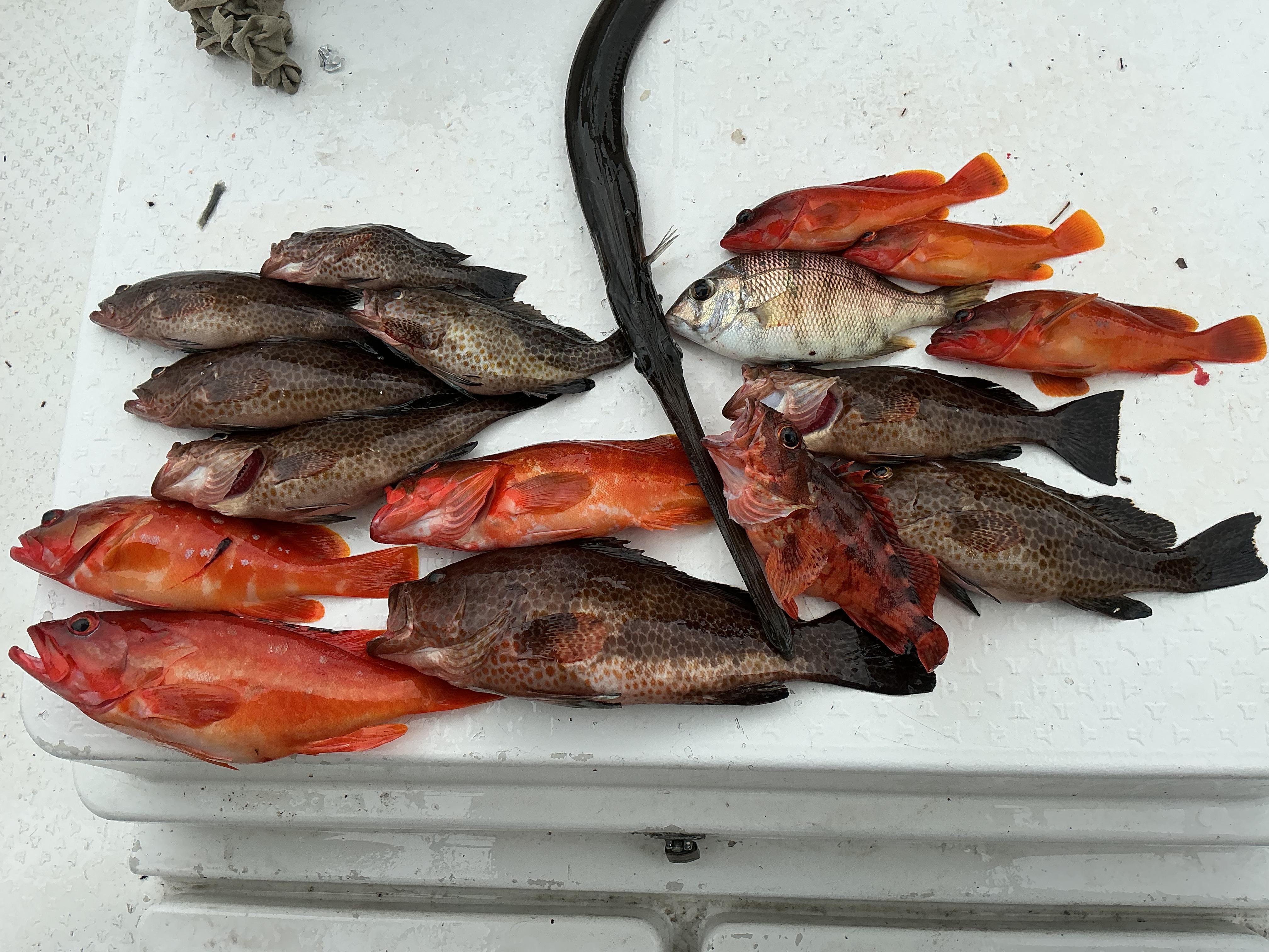 昨日は、小学生アングラーさんを含む4名様での出船でした。海は穏やか、曇り空でこの時期にはなかなかの釣り日和。近場からポイントを転々としていきましたが、次々にヒット。どこで、何が喰ってきたか、正確に記憶していませんが、とにかく退屈しない程度に当たりがあり、小学生アングラーさんも含めて、皆さん釣果を伸ばしていかれました。小ぶりなものやデカオジサンなどはリリース。デカ版の当たりで、針バレやラインブレイクが何回かありましたが、オオモンハタやアカハタの40センチ級も混ざり、なかなかの釣果となりました。 ![]() |