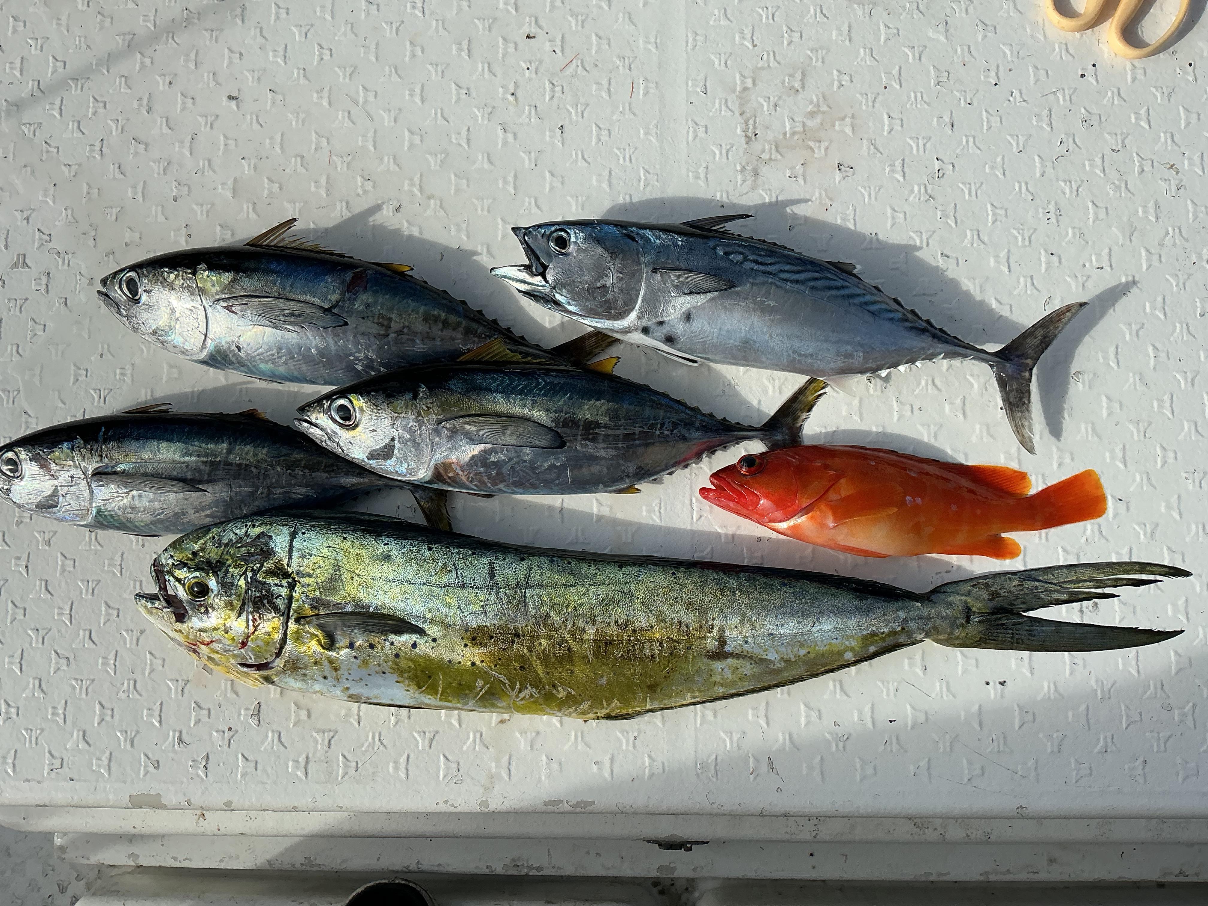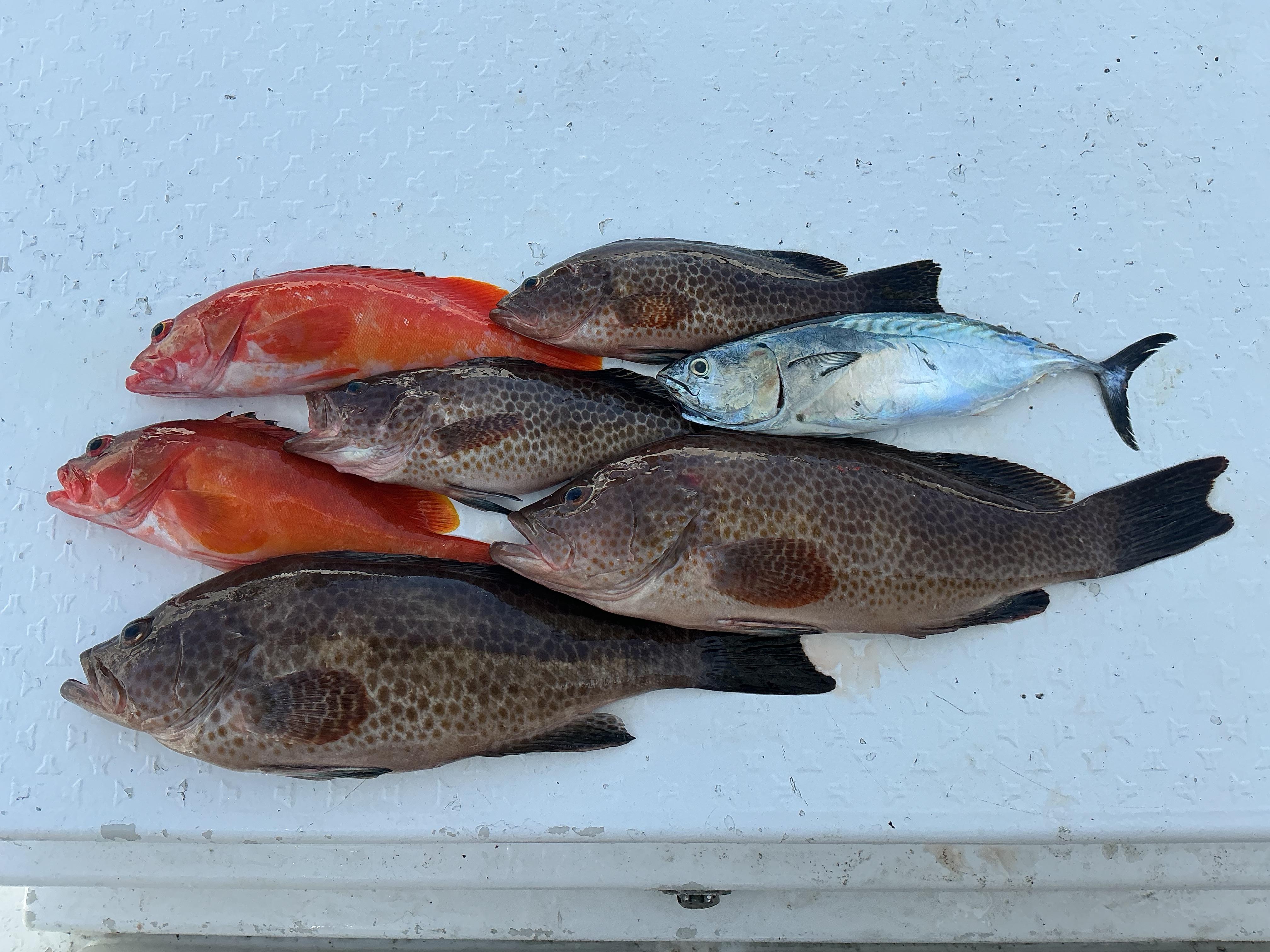 昨日も海は穏やかで釣り日和。午前ハーフはチャーター便でした。潮の向きや速さがコロコロと変わるので、昨日釣れたから今日も!というわけにはいかない状態です。近場からスタートすると早速45センチ弱のオオモンハタがヒット。しかし、その後当たりが少なめで移動、ポイントの付け直しを繰り返しながら、ポツポツと拾い釣り。最後はカンパチらしい当たりもありましたが針バレ。結局は根魚祭りとなりました。午後は沖の瀬を攻めましたがオオモンジュニア。さらに沖に出ようとすると、潮目に流木を発見。 もしかするとシイラがついているのではと大きくUターンしてキャスティング開始。するとポッパーにヒット。70センチ弱のメスのシイラでした。そのお友達を狙ってキャストを繰り返しますが、ここまで。さらに沖に出ると時折、パシャパシャとフイッシュイーターが出ます。ここでもキャスティングをすると、ヒット。暴れ回って上がってきたのは、キハダマグロの子。ヤイトも混ざりましたが、ラインブレイクというか一瞬でジグをやられる当たりが連発。いろんな奴が回っているようでした。終わってみれば下の写真の通りでキャスティンgooとなりました! ![]() ![]() |