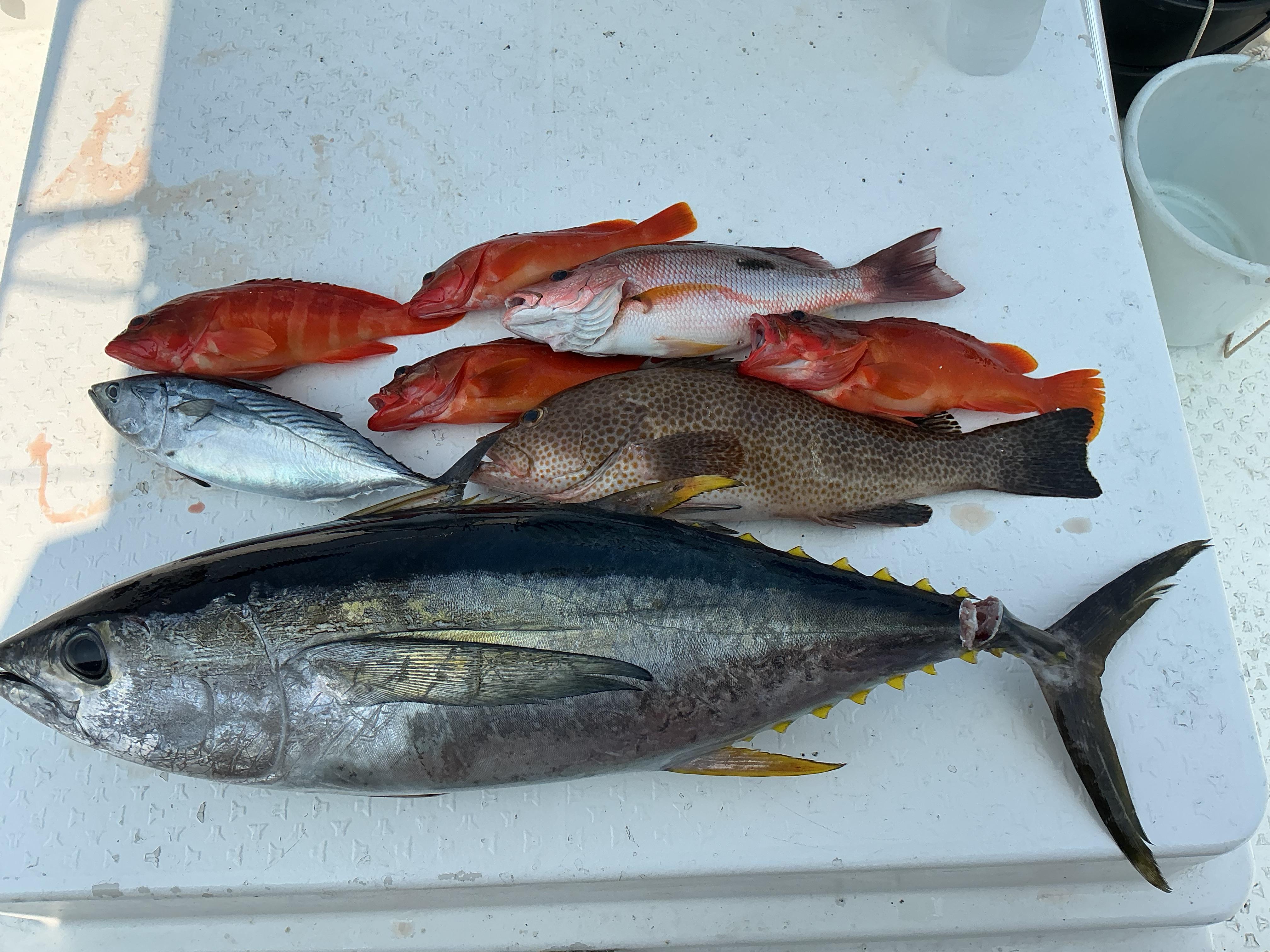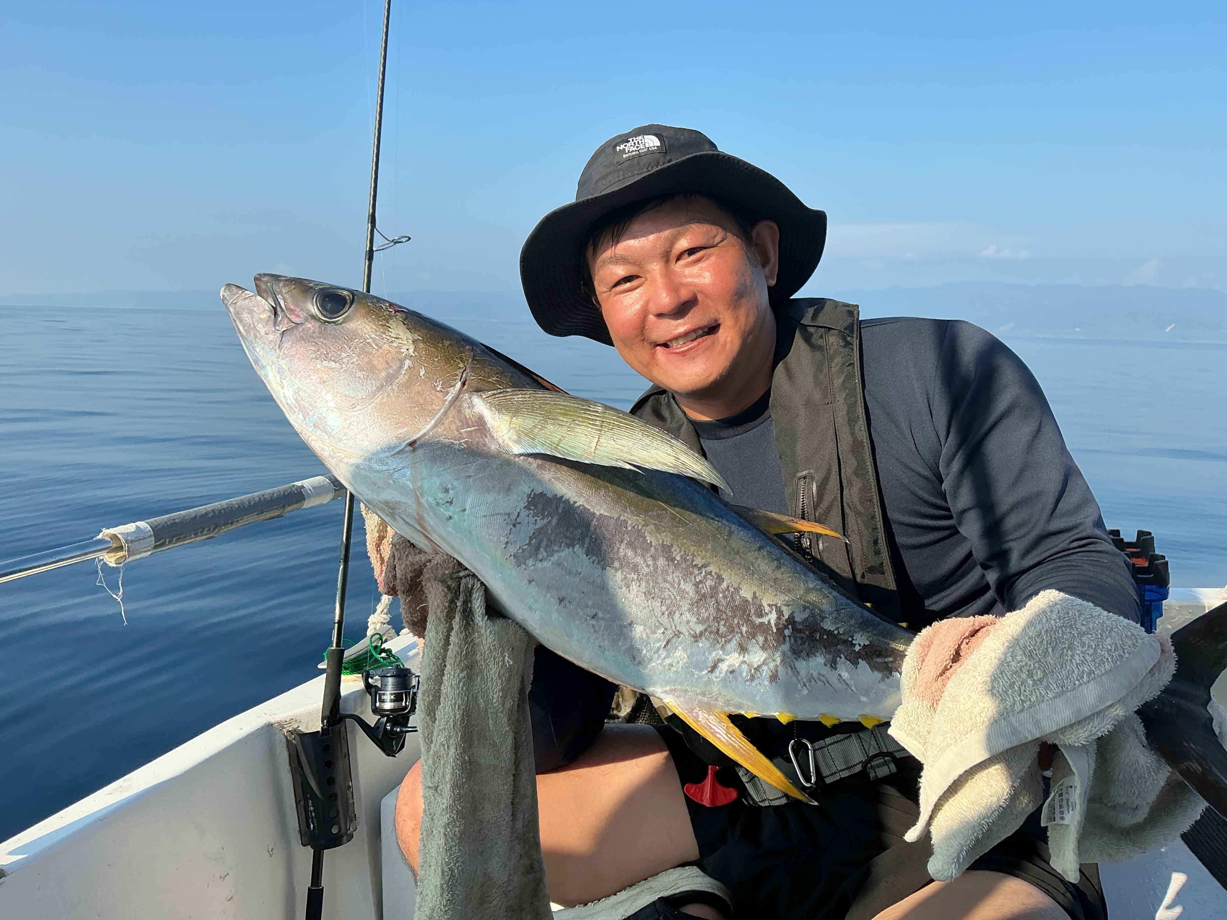 昨日も午前ハーフで出船。海は穏やかで微風もあり、絶好の釣り日和。良型オオモンハタを狙いに行きましたが当たりなし。すぐに沖に出ました。沖も沈黙でしたが、8時くらいからヤイトがパシャパシャと出始め、活気が出てきました。ここで、ヤイトやアカハタ、クロテンなどをゲット。すると、いきなり、50メートル程離れたところで、マグロがボイル。ボシャッ、ボシャッ、ボシャッと本気モードのボイルでした。ソロ〜と船を近づけてキャスティング開始。「喰ったぁ」「バレたぁ」「喰ったぁー」と船上で声が飛び交います。さすがマグロ!船の近くに寄せるのに10分程。シーバスロッドにPE1,5号、リーダー8号のタックルで丁寧なファイトが続きました。船の下に寄せてきて、タモ入れ体制に入ってから10分程。浮かしたと思ったら、すぐに突っ込まれて一進一退の攻防が続きます。ようやく浮かせてタモ入れに入ろうとした瞬間、再び潜航。それから再度5分間ほどの攻防が続き、ようやくランディング成功!仕留めたのは、8、1キロ、85センチ、グッドコンデションのキハダでした。その後50センチ弱にオオモンハタも仕留めて、終了となりました。 ![]() ![]() |