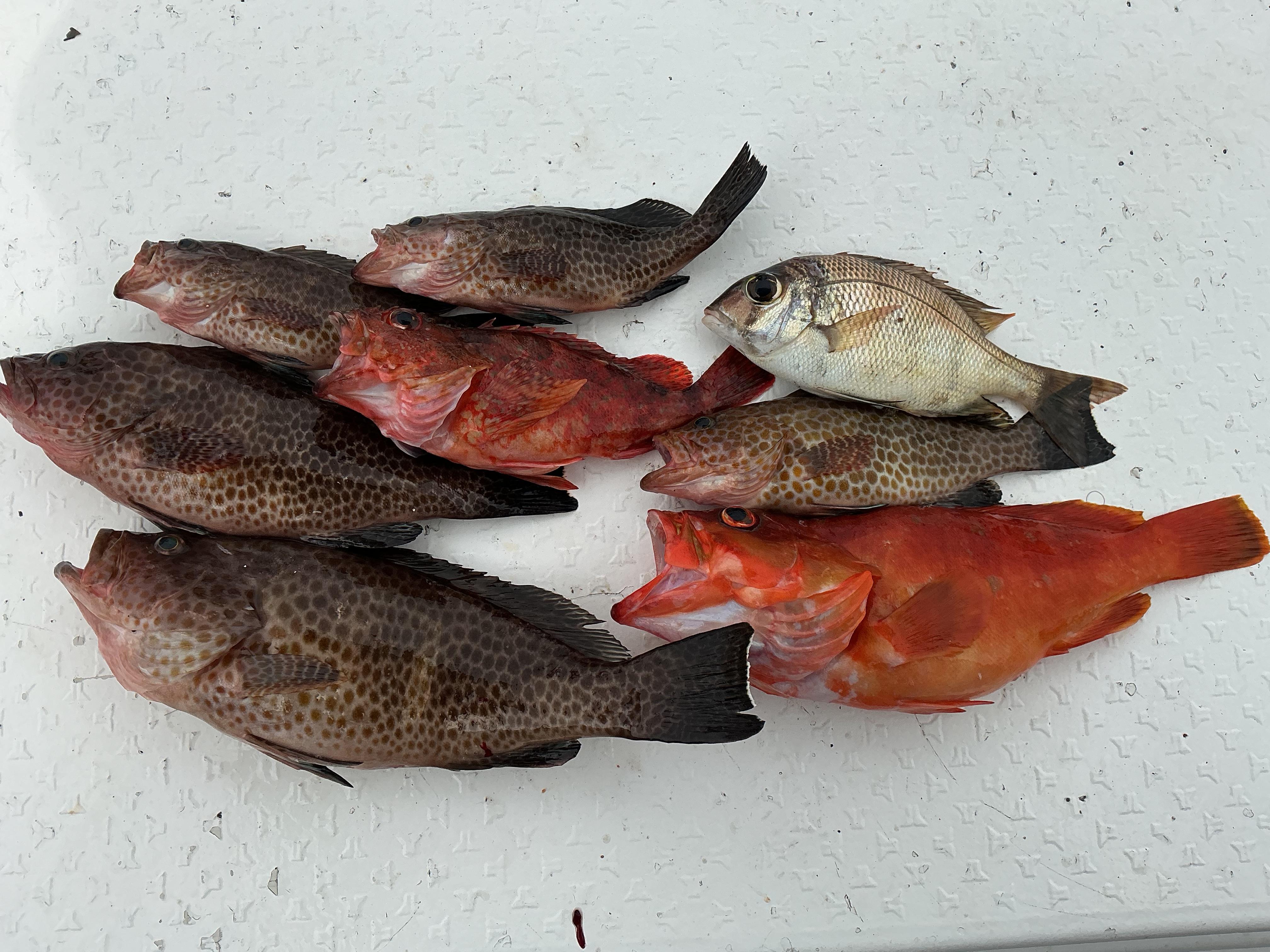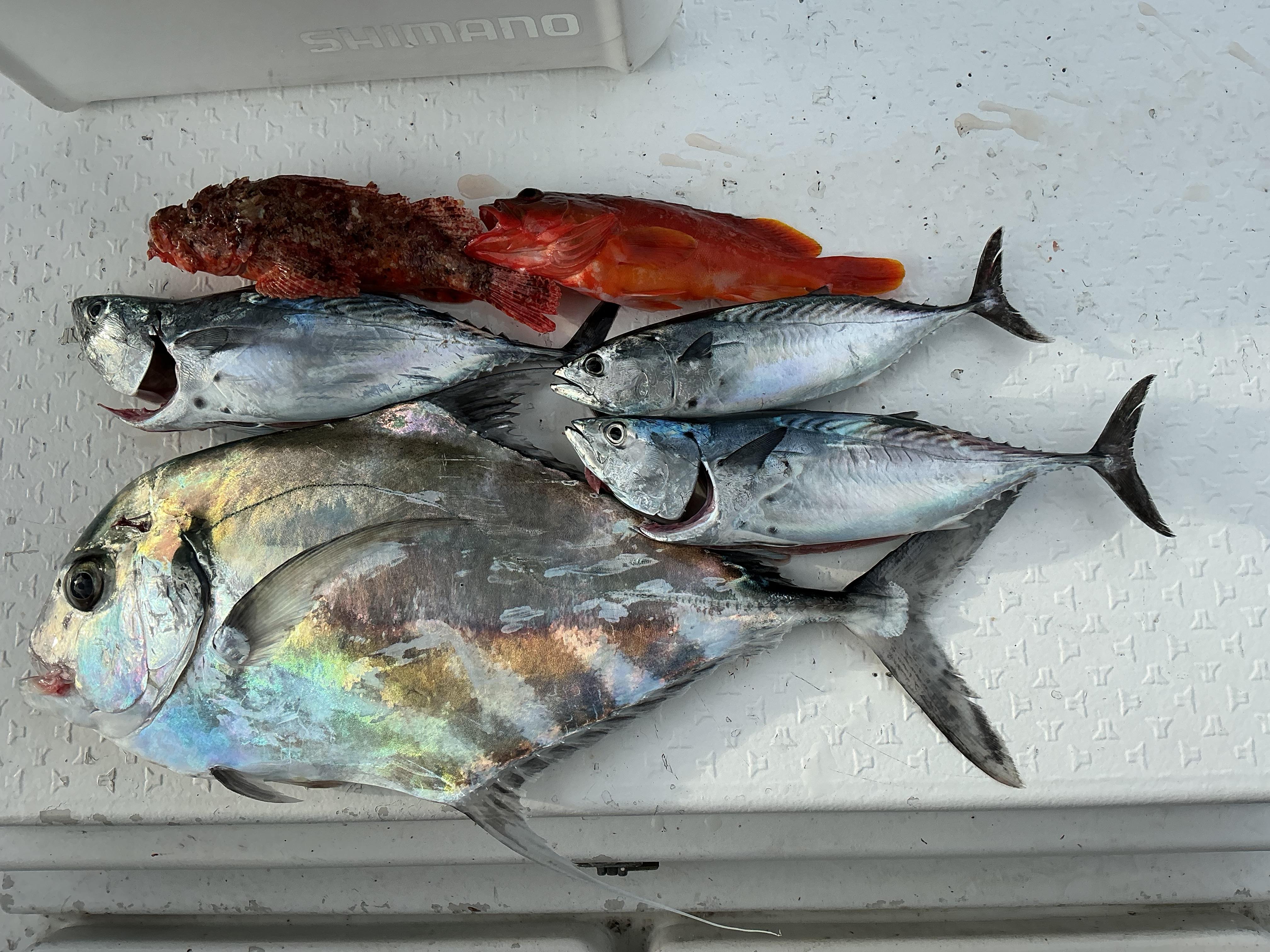 昨日も海は穏やかでしたが、雷の可能性ありということで、雷レーダーを継続的にチェックしながらの釣行でした。潮が動いておらず、風向きが変わると、船の流れが変わるという状況。そんな中でも、午前ハーフは40オーバーのオオモンハタやアカハタなどをゲット。午後も潮が動かない中、ヤイトやアカハタをゲット。納竿間際にイトヒキアジの70クラスを仕留めて終了となりました。帰港前にようやく下りの潮が入ってきましたが、なかなか厳しい釣行でした。しかしながら、こんな状況でも、皆さんオミヤをしっかりゲットされ脱帽です。先日の、キハダとの格闘や、これまでの大物とのファイトも思い起こされましたが、心技体があってこその釣果だと思います!写真は上が午前ハーフ3名様、下が午後ハーフお一人様の釣果です。 ![]() ![]() |