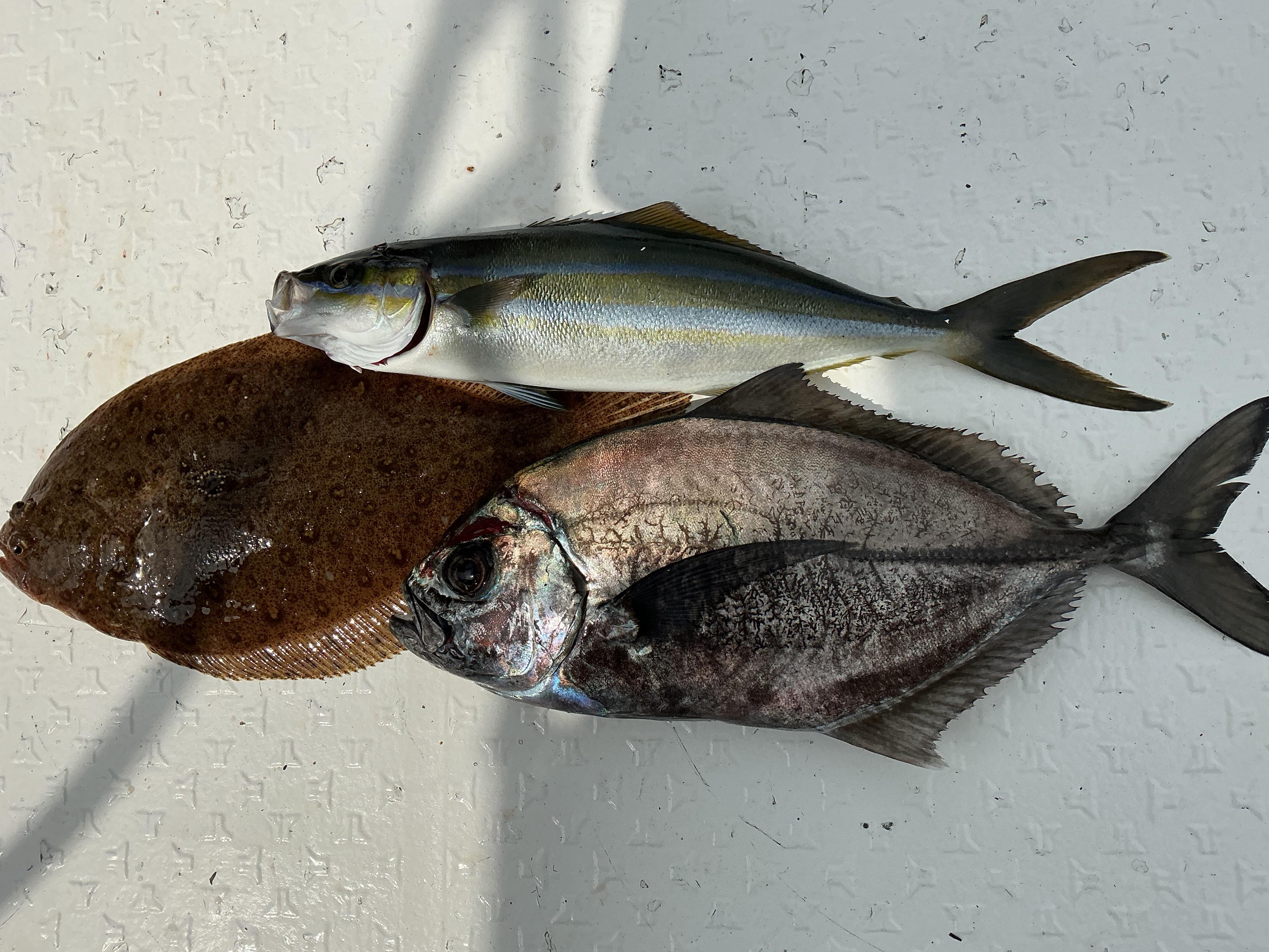 昨日は午前ハーフ、親子さんの釣行でした。近場での様子見で、ガンゾウヒラメ!沖に出るとベイトの激アツがかなり出ましたが、潮が動いておらず、当たりがありませんでした。ポイントを転々としますが、口を使うフィッシュイーターがおらず、苦しい展開。後半、ようやく少しだけ上りの潮が動くと、ツバメウオの群泳。よくみると、ベイトが泳いでいるのも見えました。するとここでいい当たり。竿先を絞り込みながら、徐々に姿を見せたのは、美味そうなオキアジ。1日くらい寝かせて刺身にすると、甘味があって美味しい魚です。さらに、ツンブリ。残念ながら、潮もすぐに止まってしまい、終了となりました。 ![]() |