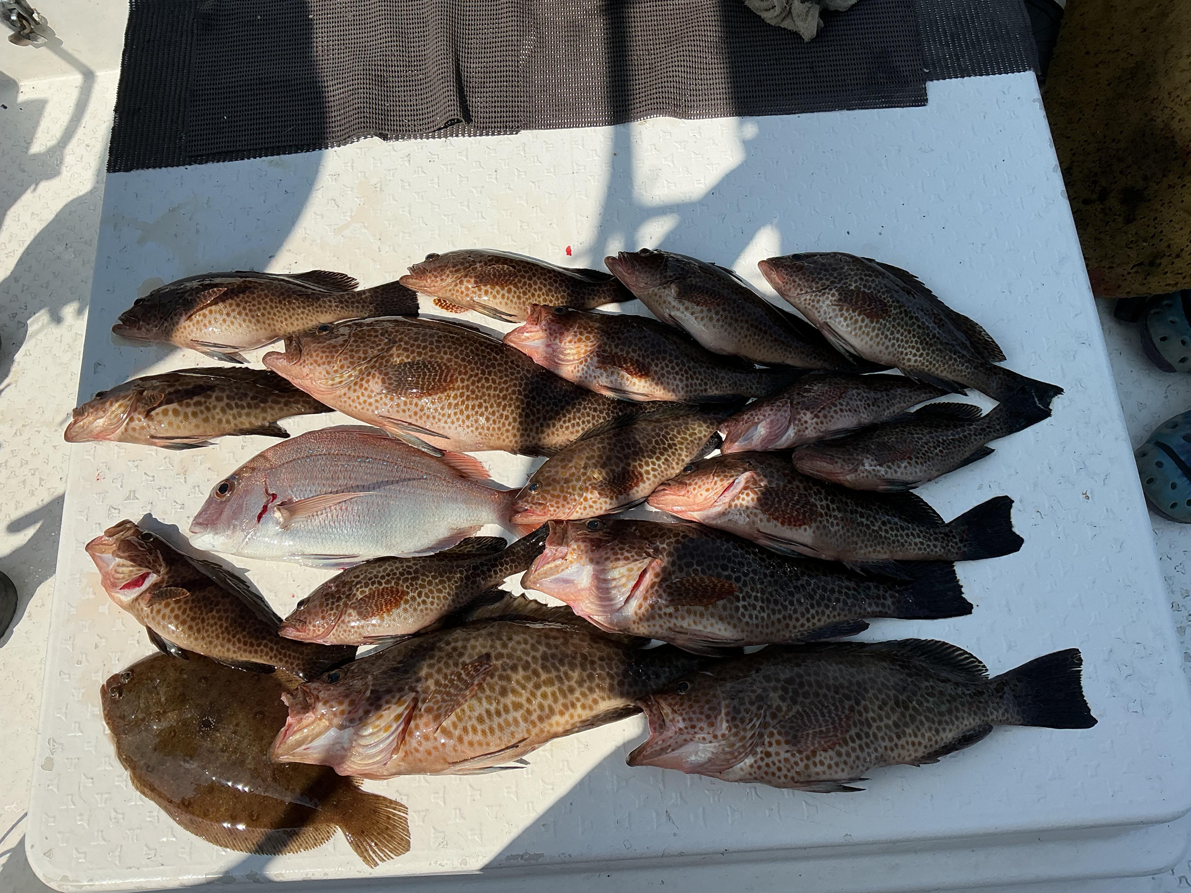 昨日は午前ハーフお二人様チャーター状態での出船でした。タイラバメインということで、近場でのオオモンハタ狙い!前日と違い、上りの潮が来ていました。お一人は始めたばかり、もうお一人は初めてのタイラバ。「タイラバは底にいる魚を狙う釣りなので、タイラバが底に着いたら、すぐに巻き始め、7、8回巻いたら落とし直してください。当たりがあってもそのままーーー」とレクチャーさせていただいた後、早速釣り開始。すると一投目から当たり。30センチオーバーのオオモンハタ。ここでボーズがなくなり、一安心。と思ったら、すぐにいい当たり。47センチの良型オオモンハタ。直後に43センチ。アッという間に良型3本を仕留められました。ビギナーズラックって本当によくありますね〜!その後もお二人で釣り続け、もう1人のアングラーさんは40センチ程のアイシャドウが美しい真鯛も追加。絶好調のエース級タイラバを大物に持っていかれ、釣果が落ちたものの、写真の釣果となりました。40オーバーこれだけ揃うのも珍しいですね!凄っ! ![]() |