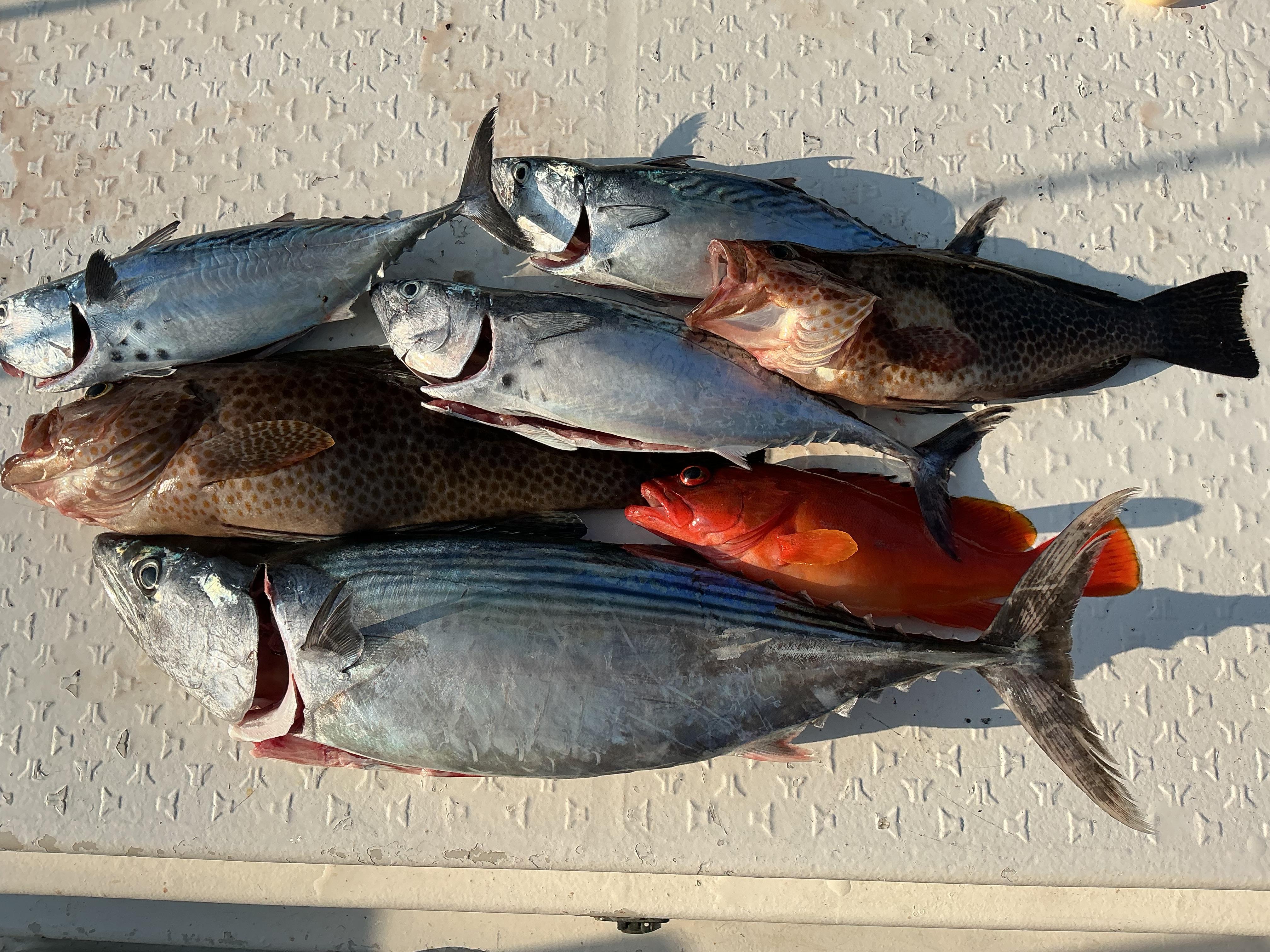 昨日は、台風のうねりが収まるのを待って、午後ハーフお一人様の出船でした。シケ前にオオモンハタが釣れていたポイントに行くと、早速、オオモンハタ。さらに沖では、ベイトの激アツ反応が出ると、竿先を引き込むいい当たり。重量感がありますが、竿先が小刻みに震えるカツオ系の引き。上がってきたのは55センチ程の、美味そうなハガツオ。さらに、パシャパシャと出ているナブラをキャスティングで狙い、ヤイトを次々に追加。最後にオオモンハタの40オーバーを仕留めて終了となりました。シケの後で、魚がいるのか、口を使ってくるフイッシュイーターがいるのか不安な出船でしたが、釣果に恵まれ、ほっと一安心の釣行となりました。 ![]() |