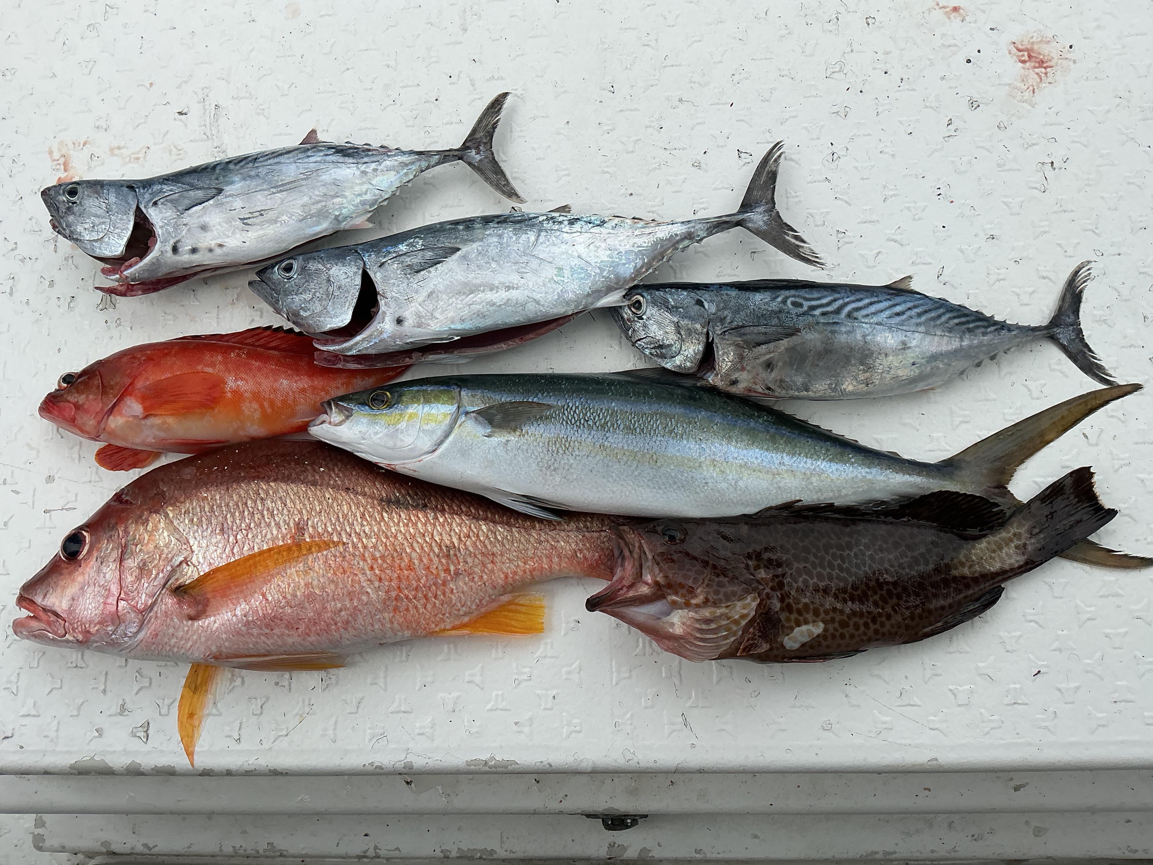 昨日は半月ぶりの出船でした。予報によっては、強風予報もありましたが、最後まで釣りを楽しむことができました。やっぱり、海は気持ちがいいですね〜!さて、釣果としては、近場の様子見ポイントでオオモンハタをゲット。沖に出ると、いきなりヤイトガツオがダブルヒット。ここで、全員安打で、ホッと一安心。その後も、ツンブリや50センチ弱のクロホシフエダイ。アカハタなどを次々に追加して、終了となりました。当たりが連発という状況ではありませんが、針バレも多く、口を使うフイッシュイーターがいることは確認できました。写真は3名様での釣果です! ![]() |