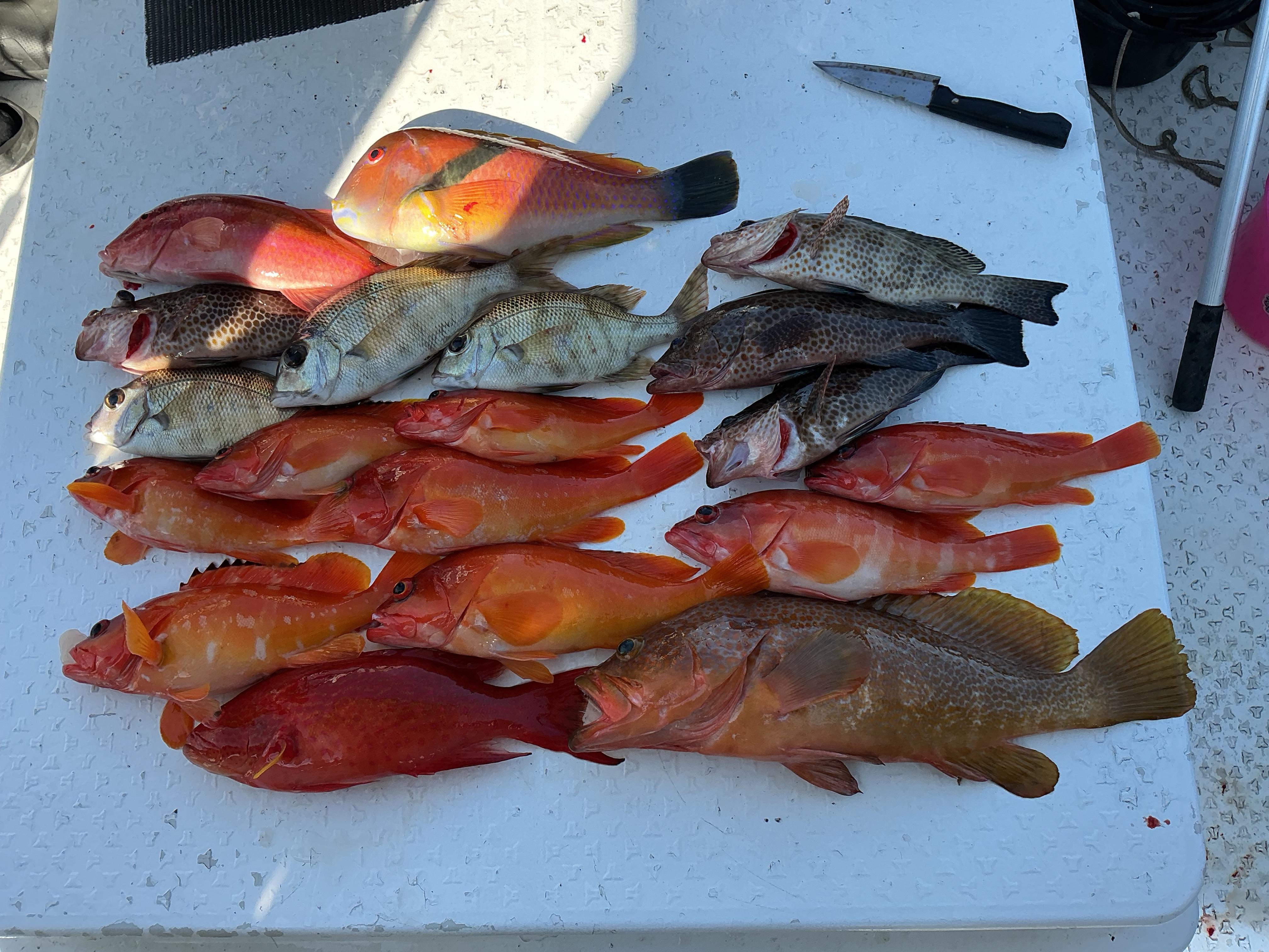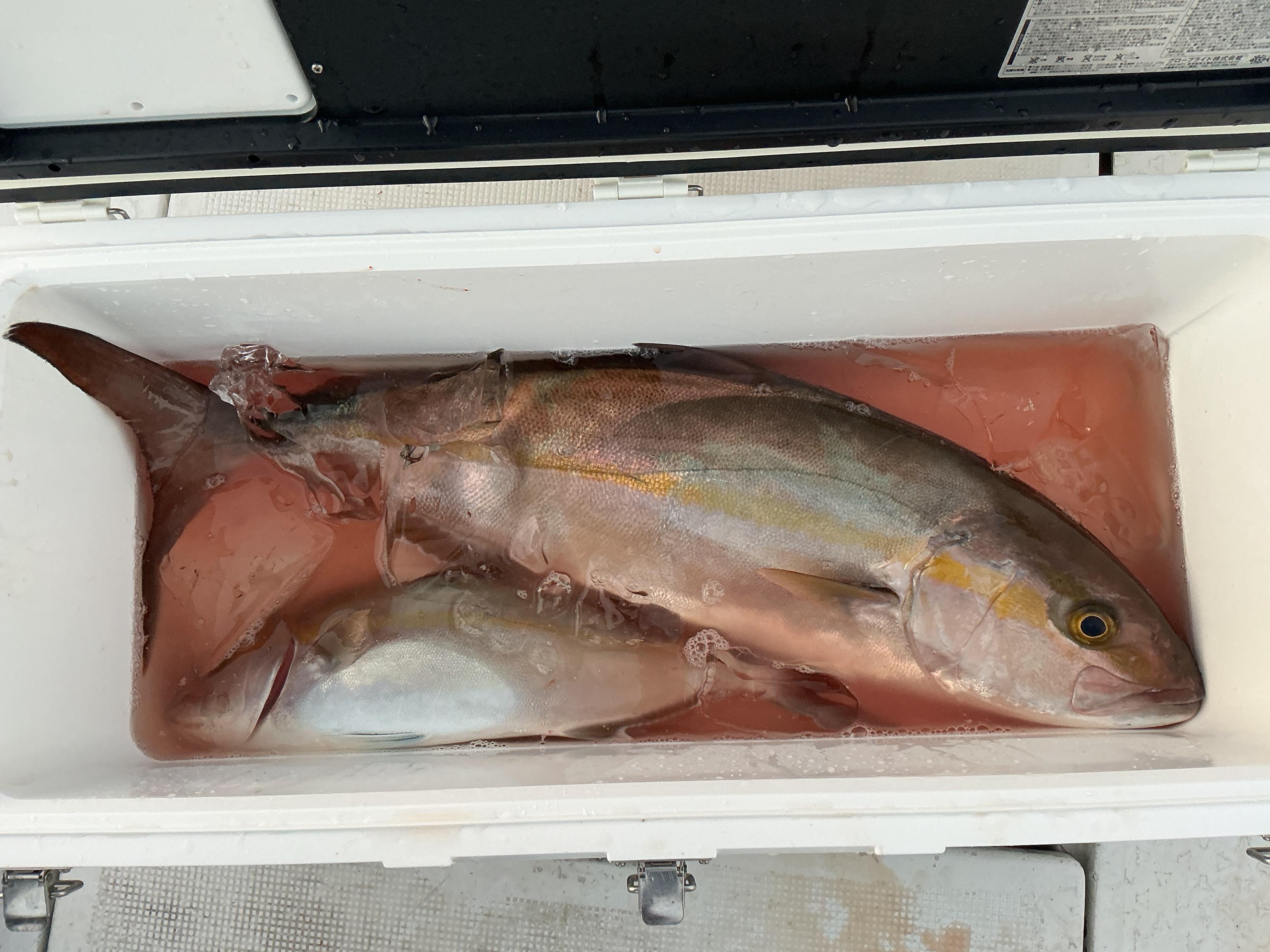 出ました!まずは午前ハーフから。昨日のカンパチを夢見て沖の瀬スタート。しかし,ベイト反応がイマイチ。それでも、アカハタやオオモンハタが次々に上がりました。するといい当たり。カンパチの引きではありませんが,重量感のある引き。上がってきたのは、本船のランカークラスのキジハタ。スーパー高校生アングラーさんが46センチの、ど迫力のキジハタを仕留めました。午後はお一人様チャーター状態で,再び、沖の瀬に!ベイトがいない,潮が動かないという嫌な状況でした。とりあえず,お土産確保という事で,ちびっこのジグで根魚狙い。すぐにアカハタが次々にヒット。その後,ポイントを移動して,再びカンパチ狙い。キタ〜〜!何度も海底に向かって突っ込んでいくカンパチ特有の引き。上がってきたのは50センチオーバーのカンパチ。同じ流しでまたまたヒット。今度もカンパチ特有の引きですが、ドラグ音を鳴らしながらラインを引き出すダッシュの距離が長い!竿もかなりの曲がりで、先程のカンパチとはサイズが違うということがすぐにわかりました。絶妙なドラグコントロールで効率よく浮かせてきたのは、84センチ,6kgの見事なカンパチ!一昨日,久々にカンパチの顔を拝んで感激したのも束の間、ビッグワンとの嬉しい出会いとなりました! ![]() ![]() |