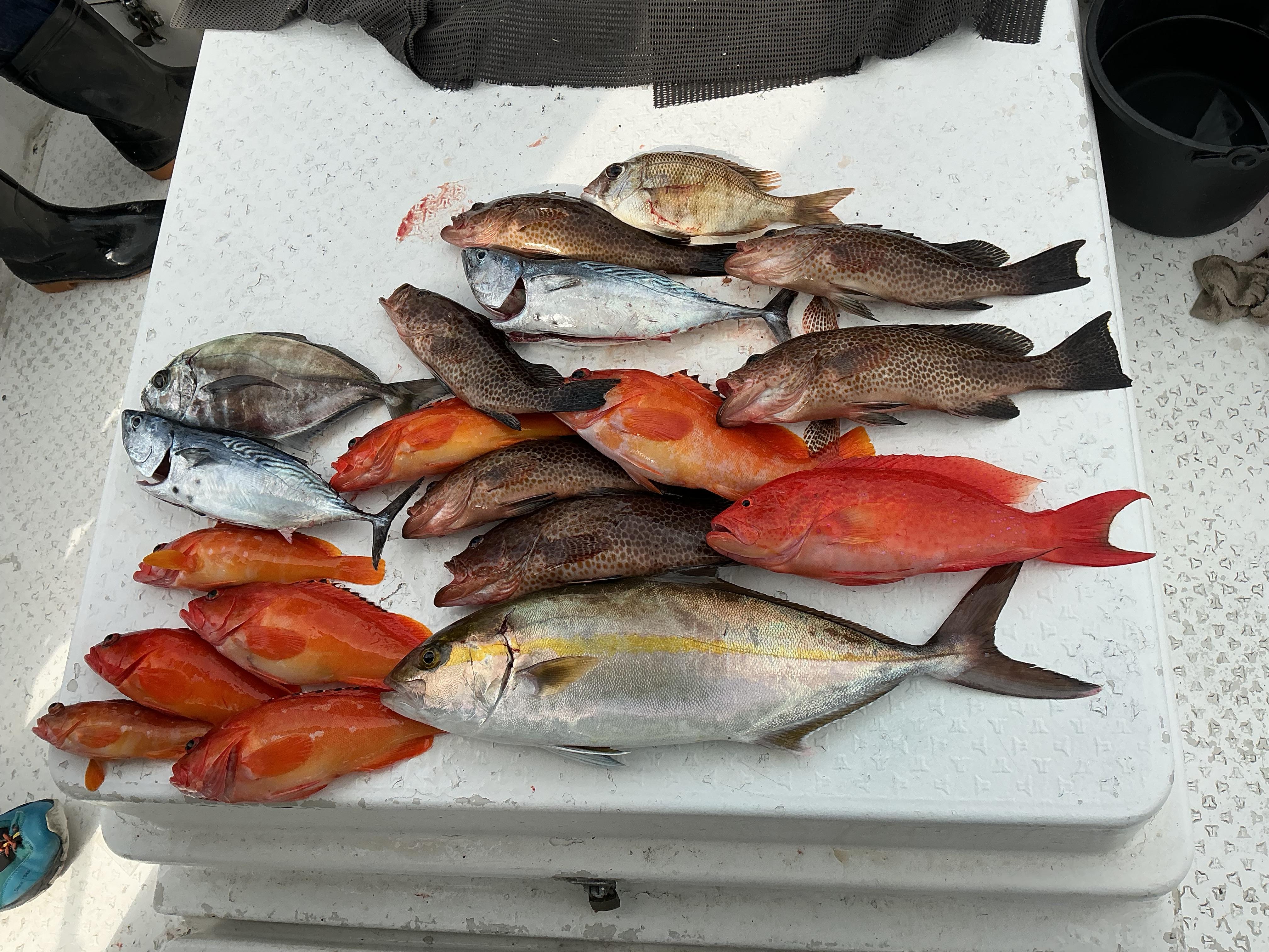 昨日は午前ハーフ3名様で出船。予報ではベタ凪かと思いましたが、北西の風で多少の風波がありました。いけるという判断で一気に沖に出ました。すると,早速ベイトの好反応。中層まで巻き上げたジグにいい当たり。何度も何度もラインを海底に引き込みます。この感じはカンパチ!見えてきたのは、予想通り、60オーバの美しいカンパチでした。幸先は良かったもの,アタリ沈黙!ポイントを諦めて大きく移動。するとすぐにアカハタ、アカハタ、アカハタ。砂地のポイントでは,オオモン,オオモン,オオモンという感じで釣れました。ヤイトやバラハタ,オキアジ、メイチダイを追加し、終わってみると,皆さん,食べきれないほどの釣果となりました♪ ![]() |