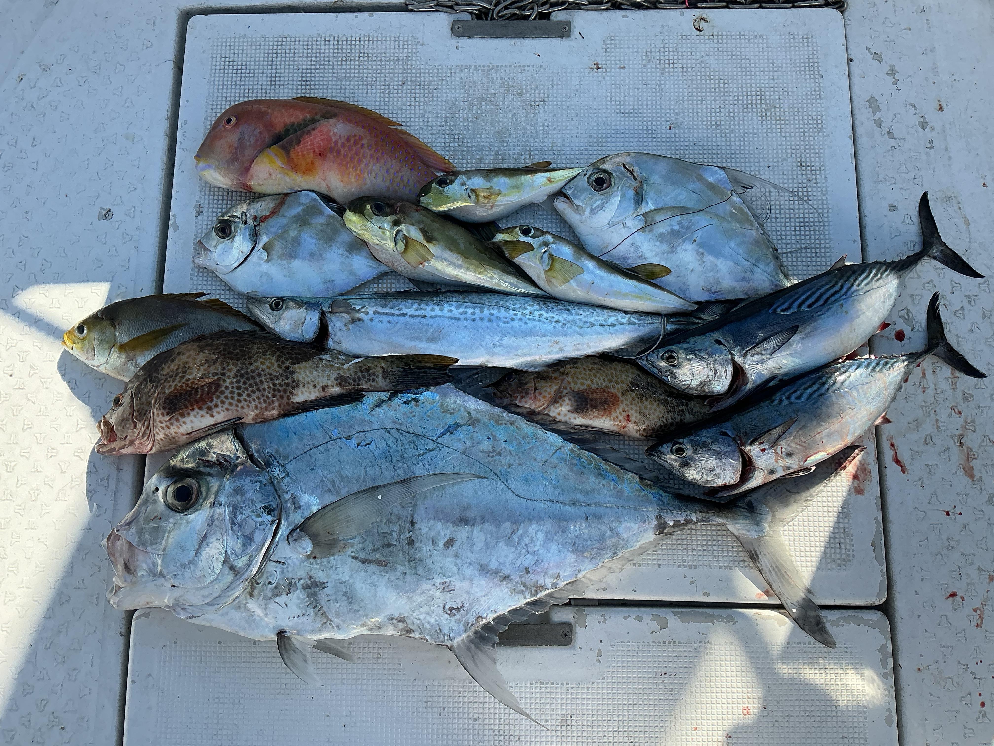 午前ハーフは初心者の方を含む3名様で出船。風波があり,風除けのポイントへ。長い間,ジギングが苦戦していましたが,ヤイトやサゴシ,イトヒキアジが次々にヒット。風が緩んできたので、ポイントを移動すると、早速いい当たり。ドラグ音を立てて何度も何度もラインを引き出して行きます。最初はオオモンハタのデカ版かと思いましたが、横走りを始め、こりぁ青モンだと思いました。お仲間さんから,ドラグ緩すぎじゃないの?と言われていましたが、デカ版には間違いありません。ようやく姿が見え始めると、くるくると回り始めました。浮いてきたのはイチヒキアジ!ランディングするとGTかもと思われましたが、イトヒキの糸がなくなったイトヒキアジ。80センチの良型でした。その後は良型のイサキなど,当たり連発。針バレも多かったのですが,楽しい釣行となったようです。午後からお一人様チャーター状態で出船。午前とは違って風が止み,潮が動かず、ジグが真下にドスン!嫌な予感がしましたが,予感的中!オオモン,アカハタのみとなりました! ![]() |