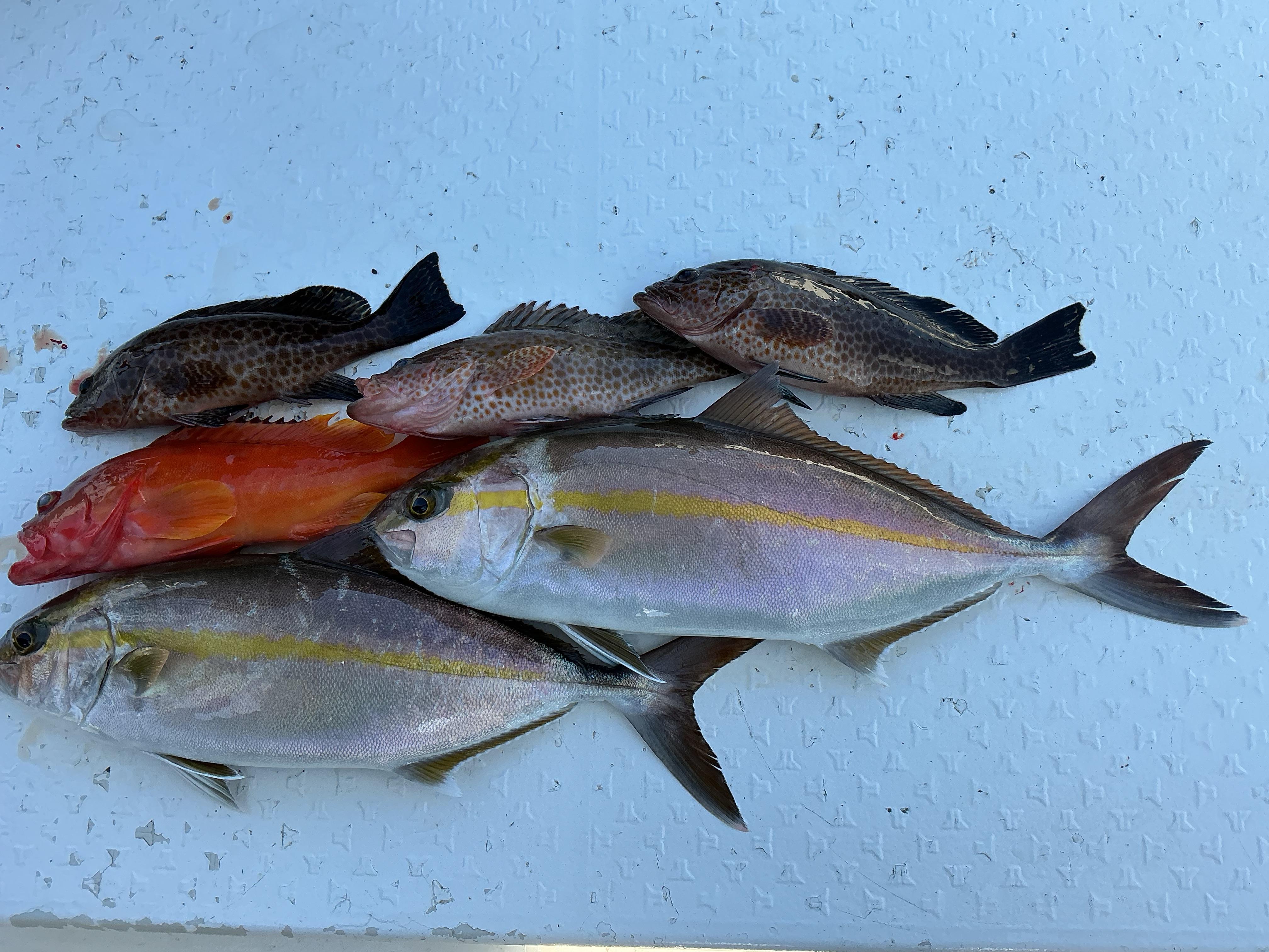 昨日は昼前から強風予報のため,沖のカンパチ狙いからスタート。ベイト反応の全く出ないポイントでいきなりヒット。海中へ何度も引き込むカンパチ特有の引き!上がってきたのは美しい50センチ程のかんぱち。続いてガーという早まき,シャクリのセットで誘っていた他のアングラーさんにもヒット。これもカンパチ特有の引き。上がってきたのはサイズアップ。体高のある美味そうなカンパチ。ゴルフの「おはようバーディ」ではありませんが、「おはようカンパチ!」となりました。しかしながら,その後潮が変化。当たりがなくなってしまいました。強風からの撤退も考え,近場でオオモン,サゴシ狙い。当たりはあるものの小ぶりちゃんだったり,竿に乗らない状況が続く中、何とかオオモン,アカハタを追加して終了となりました。 今日は北の強風予報で中止にしましたが、明日は久々の凪予報です。「安心してください♪ 空いてますよ!」 ![]() |
