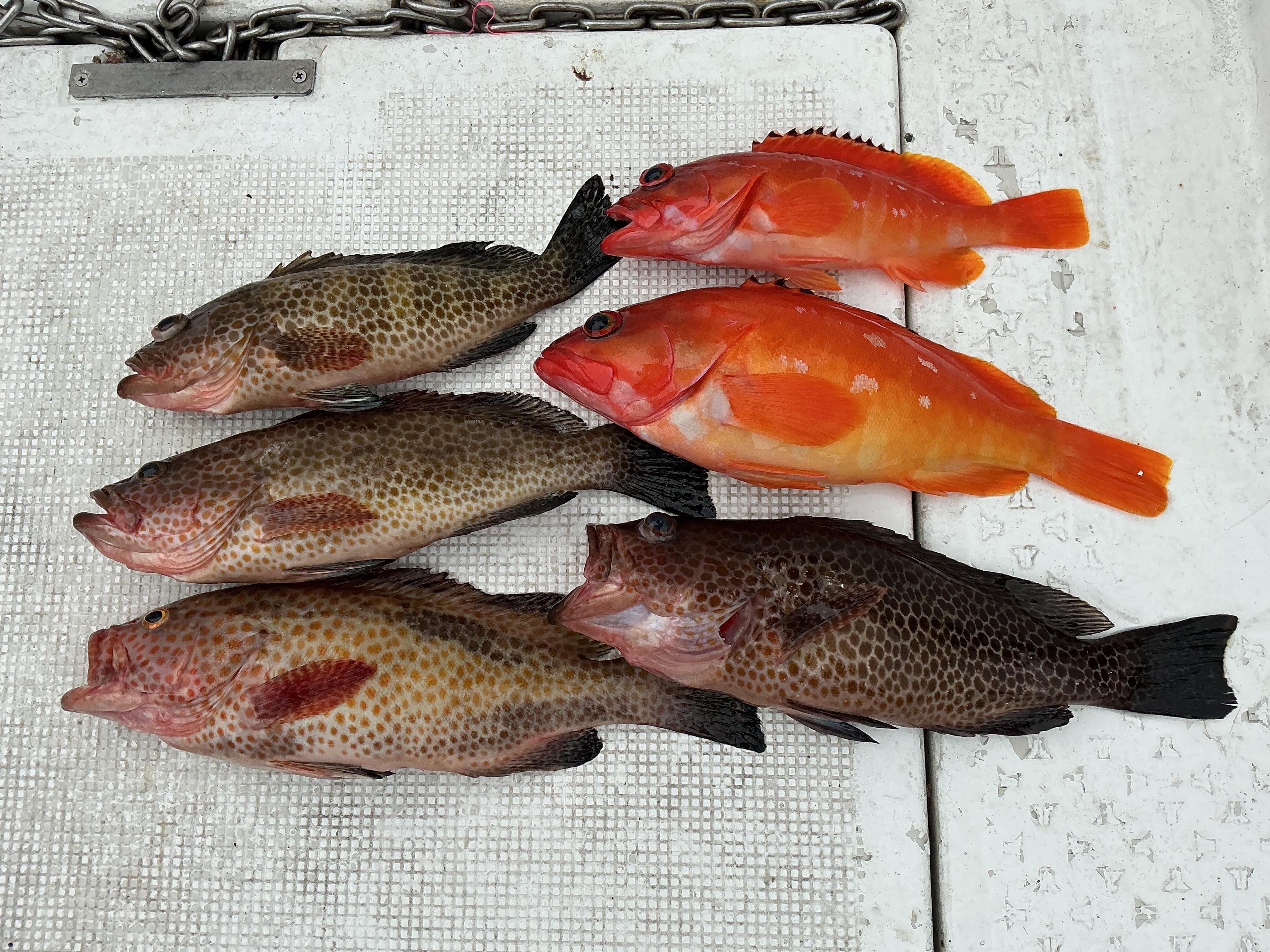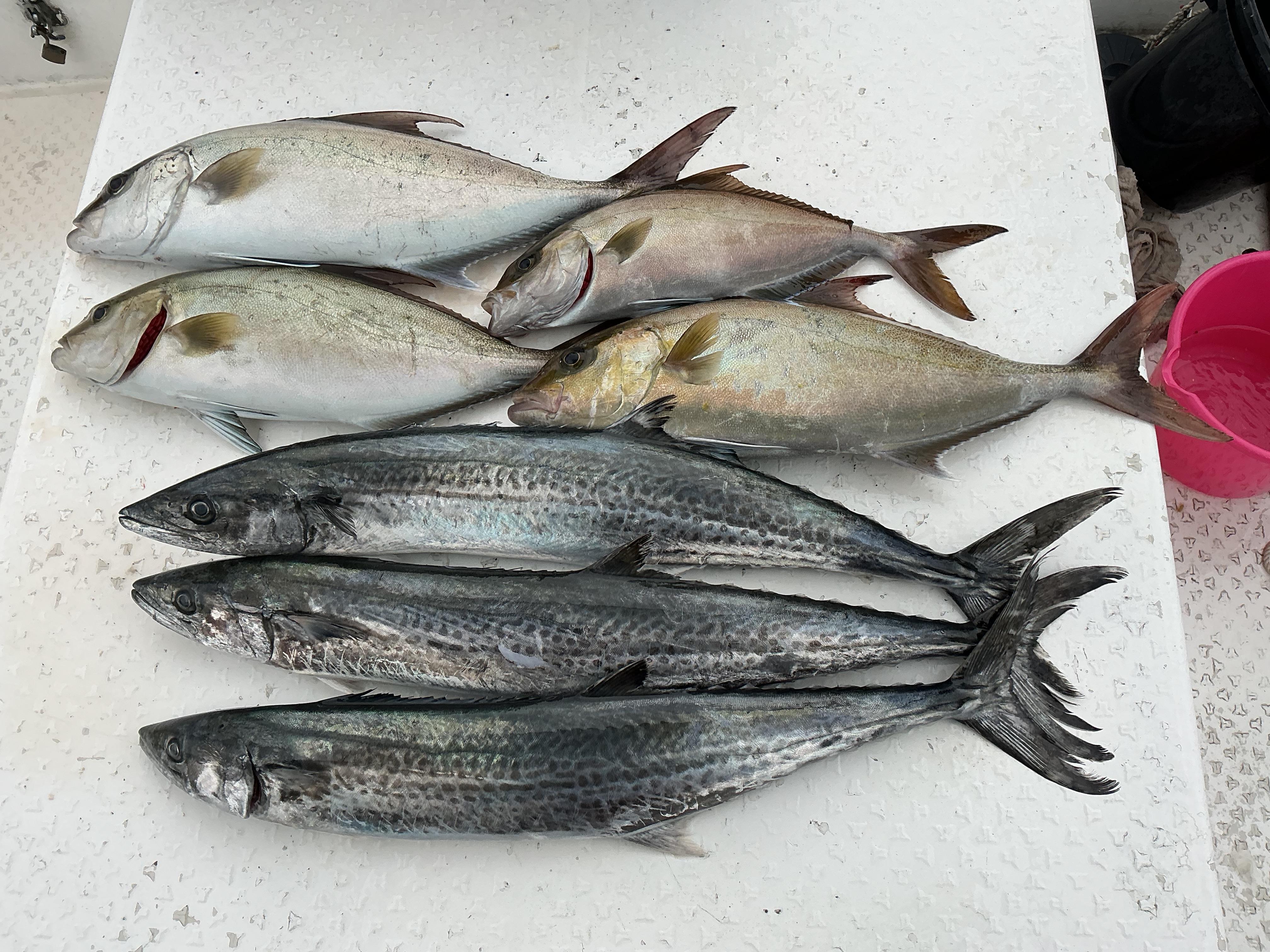 昨日はベタ凪予報を信じて、一気に沖をめざしましたが、うねりと風波があり,様子見のポイントで断念!オオモンハタは釣れるだろうと思っていると,早速ヒット! なかなかの引きで走り回ります。おそらくサゴシと思いましたが、上がってきたのは、75センチ程のサゴシ!その後,とものアングラーさんに再びいい当たり。今度は真下にぐんぐんと引いて行きます。この引きは、おそらくカンパチ。やりとりをしていると,隣のアングラーさんにも同様の当たり。ダブルヒットで上がってきたのは65センチ程のヒレナガカンパチ。その後、みよしのお二人はオオモンハタやアカハタを次々に追加。再び,とものアングラーさんがカンパチらしい当たり。するとお隣さんにも同様の当たりで,またまたダブルヒット!これも60オーバーのヒレナガでした。さらにサワラも追加して午前ハーフ,終了となりました。午後も意気揚々と出船したものの、真っ黒い雨雲が近づいてきました。30分おきに雷レーダーをチェックしていましたが、青島周辺があっという間に雷の放電圏域内に入っていて、撤退開始。港に近づくと,急な土砂降りで、これは雷の危険信号!そのまま中止となりました。 写真は午前ハーフ4名様の釣果です! ![]() ![]() |