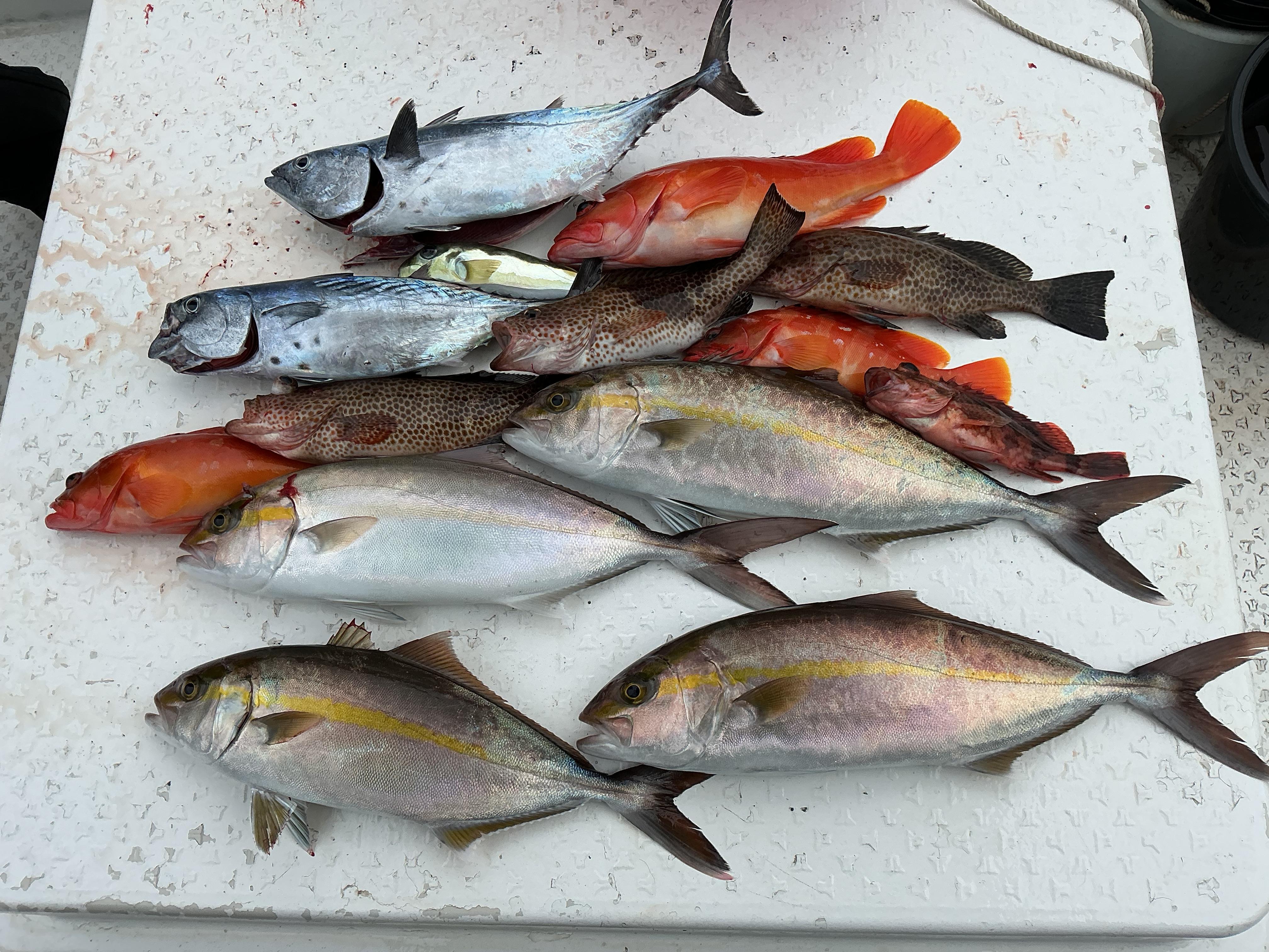 年明けから、強風の時間帯を避けながらのゲリラ的な釣行が続いていますが、昨日も昼前から強風予報。朝,早めに出船して「やれるところまで!」の出船でした。年末年始と好調が継続しているポイントで勝負!すると早速オオモンハタが喰ってきて,ボーズ回避。今度は青物の当たり。何度も引き込むカンパチらしい引き。やりとりをしていると,もうお一人にもダブルヒット。最初にヒットして、上がってきたのは50センチ程のカンパチでした。後からかけたアングラーさんは,重量感が感じられます。上がってきたのは50センチ程のカンパチが何と2匹!ちょっとややこしいのですが,ダブルヒットのダブルヒットでした。ジギング2回目という初心者アングラーさんですが,その後もカンパチ、ヤイト、オオモンハタ、アカハタを次々にゲット。予報通り風が強まり、早上がりとなりましたが,お師匠さんと共に結構な釣果となりました♪ 写真は午前ハーフお二人様の釣果です。 ![]() |