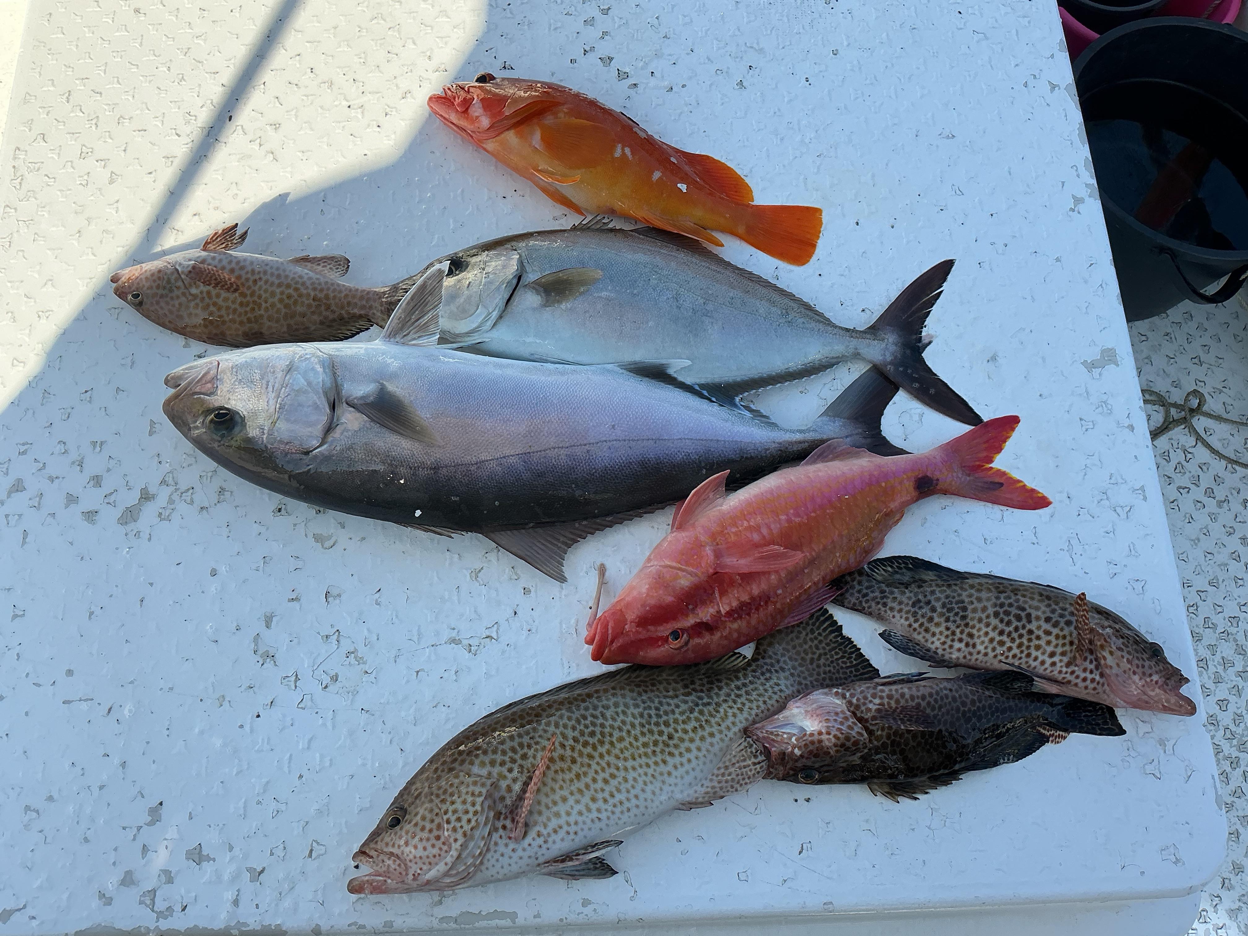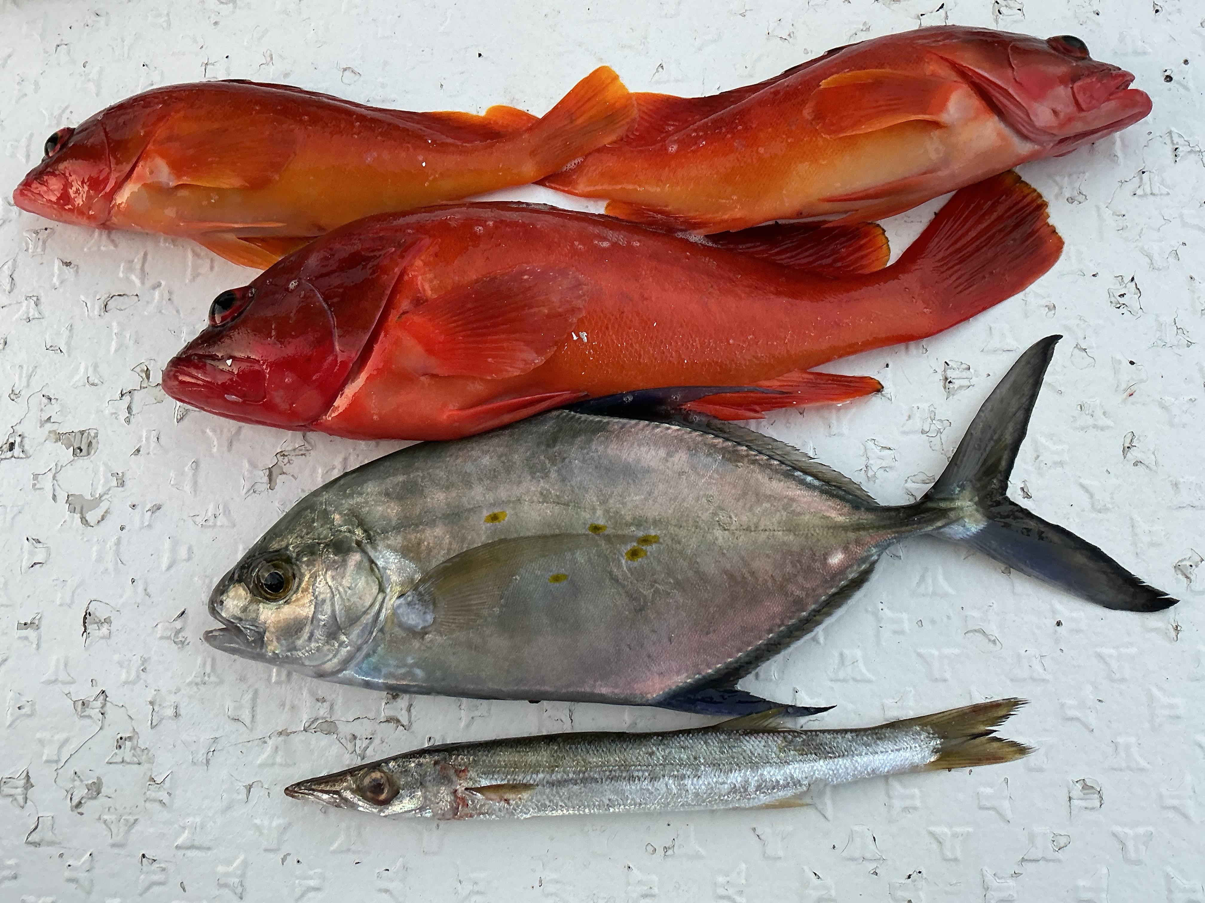 昨日午前ハーフはお一人様チャーター状態での出船。近場から攻めると,早速いい当たり。50センチ程のヒレナガカンパチスタートとなりました。オオモンなどを追加して沖へ。すると、キタ〜! 根掛かりのような当たり。ファイトが始まりますが、痛恨のラインブレイクでした。その後,すぐに同様の当たり。ドラグ音がなり、ギュンギュンと竿を絞り込みます。何とか浮かせたのは65センチの本カンパチでした。さらにアカハタなどを追加して終了。午後はお二人様での出船。チャッチャと近場を攻めながら沖へ。すると青物らしい当たり。久々に登場のナンヨウカイワリ。その後,すぐに当たり。見えてきたのは50センチ程のカンパチでしたが、残念ながら針バレ。アカハタを追加して,最後は近場勝負。諦めかけたラスト10分になって、突然のいい当たり。でかいぞ!10秒ほどのファイトで針バレ。直後にもうお一人様にもヒット。今度は5秒ほどのファイトで同じく針バレ。少なめのチャンスをモノにできるかどうかで、釣果に大きく差が出る感じでした。カンパチはいる‼︎ ![]() ![]() |