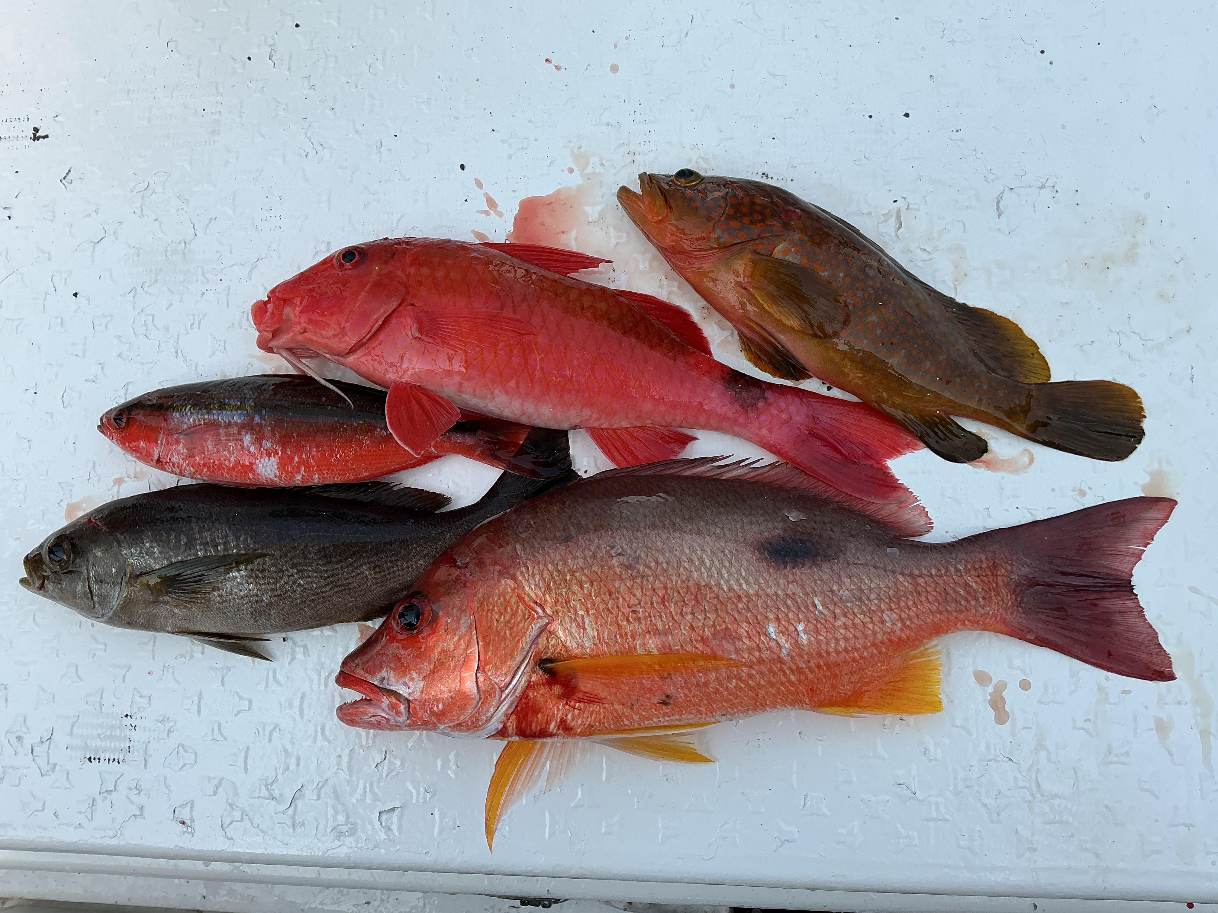 昨日は、本船初、落とし込みメインでのチャーター予約をお受けしました。一昨日まで、かなりの波があり、予報通りにうねりが取れるか心配でした。道路から海を見ると、結構な波があるようで、中止にしようかと迷いましたが、港を出ると、大したうねりもなく、いけそうな感じ!風も穏やかで、絶好の釣り日和!一気に、いつもベイトだらけの沖の瀬回りに行くと、ベイトはいるものの、潮が全く動いていませんでした。「やばい!全員ボウズ?」の不安が!しかし、ヒット。上がってきたのはイサキ!続いて、タカサゴ。その後も、オジサンや50センチ程のクロテンなどが次々にあがりました。根掛かりか瀬取られたか分からんような当たりも数回ありましたが、厳しい状況の中、全員お土産確保となりました。 ![]() |