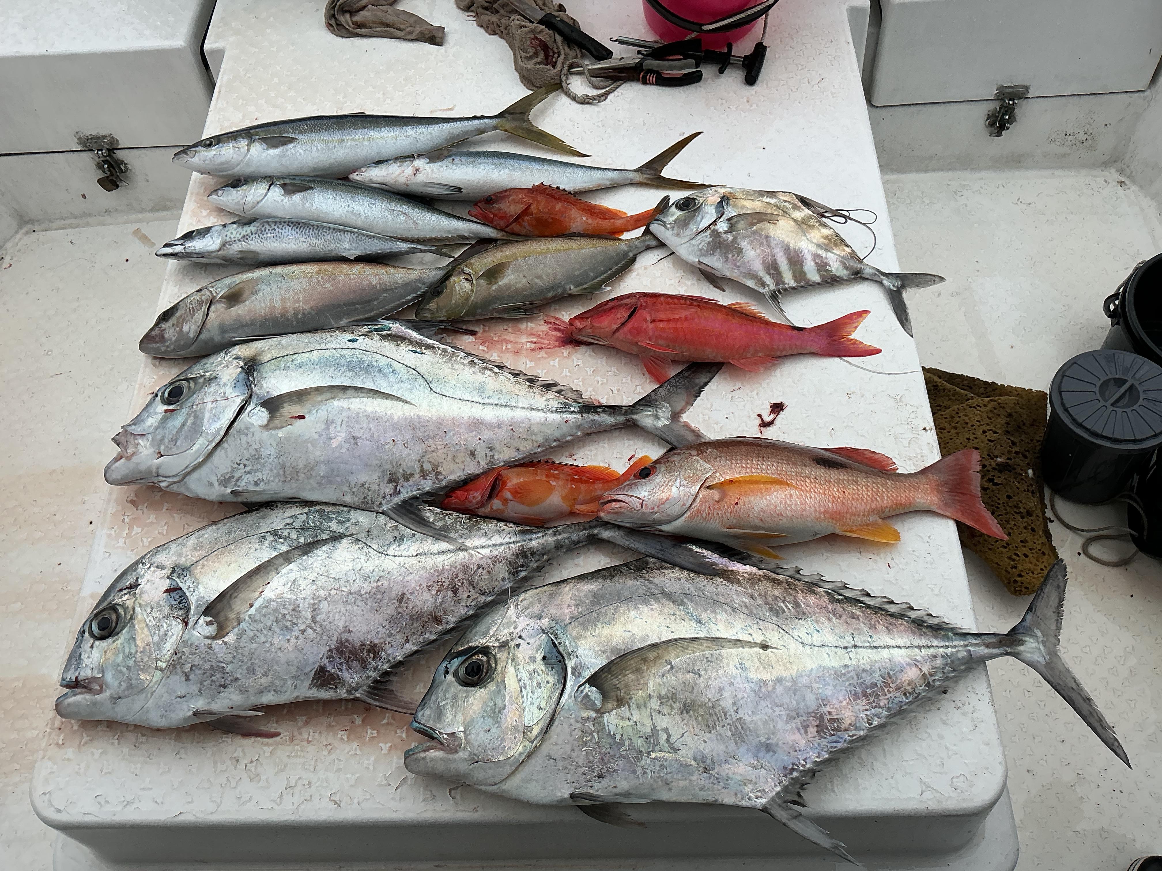 昨日はお二人様フルで久々の出船でした。海の状況が分からないのですが、とりあえず近場からスタート。当たりがなく、チャッチャと沖へ!するといい当たり。真下に竿を絞り込むいい当たり。最後はクルクル回って80センチ弱のイトヒキアジ。さらに追加。今度は50センチほどのツンブリが連チャン。浮かせて来ると、お友達がたくさん付いてきて、群れで回遊しているようでした。しかし、当たりが止まり、さらに沖へ。大物らしい当たりが数回ありましたが、バラシの連続。最後は沖のポイントに戻り、50オーバーのヒレナガカンパチやネリゴ、良型のクロテン、さらにイトヒキアジを追加して終了となりました。終わってみれば、食べきれないほどの釣果で、私も一安心。めでたし めでたし!といったところでしょうか⁉︎ ![]() |